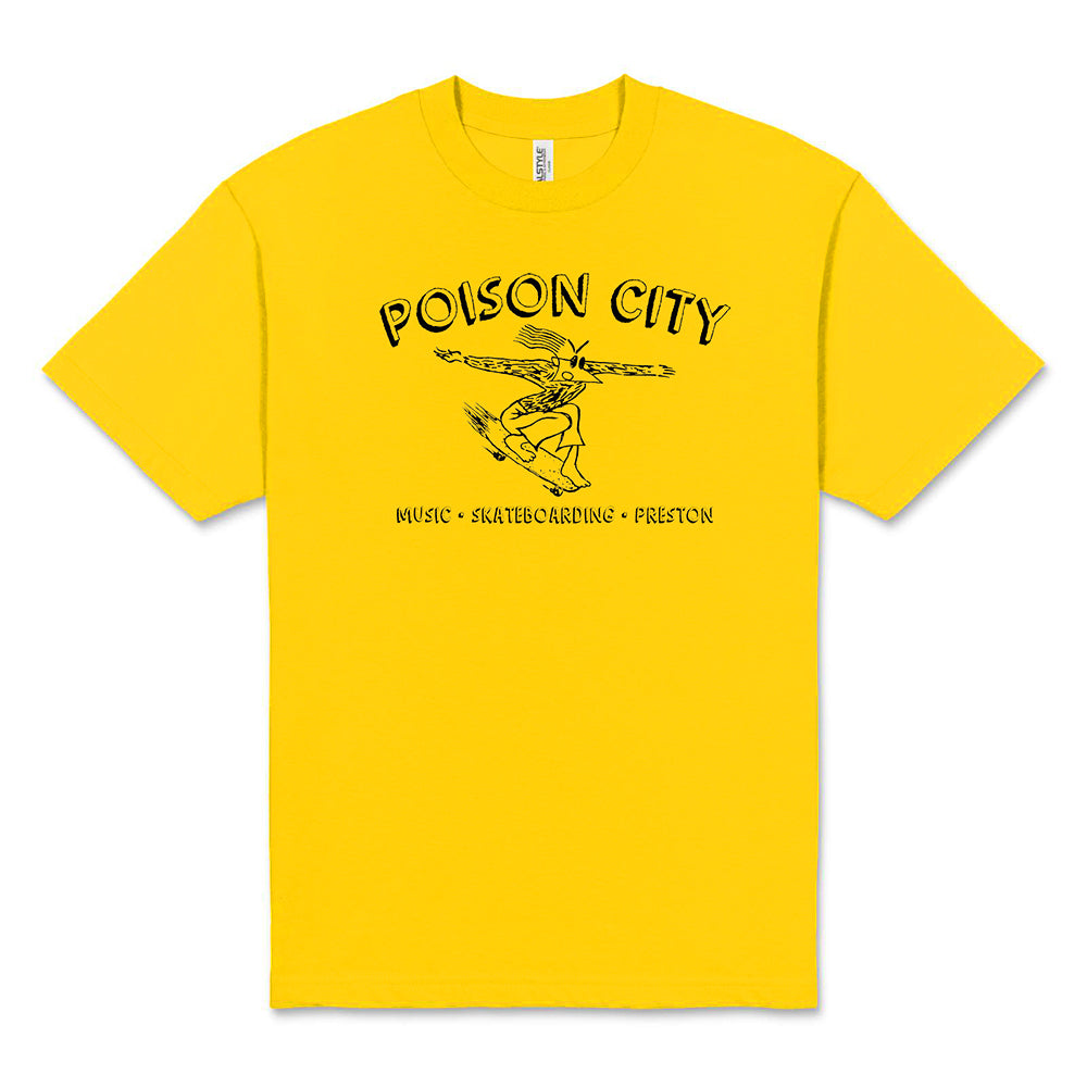 ** NEW ** Poison City 'Music - Skateboarding - Preston’ adult size T-Shirt. Front print on Golden Yellow regular fit, heavy weight Alstyle t-shirts. Original illustration by Alex Coxen (Worn Spiral). Limited run! ** Please note, the Medium sizes are a slightly lighter Yellow colour.