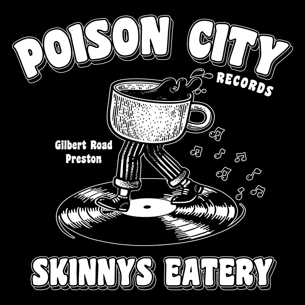 A special collaboration t-shirt celebrating our little Preston community! POISON CITY RECORDS x SKINNYS EATERY. Design by C//E and hand screen printed locally by Too Far Gone. Limited run!!! Printed on premium weight, regular fit AS Colour tees.